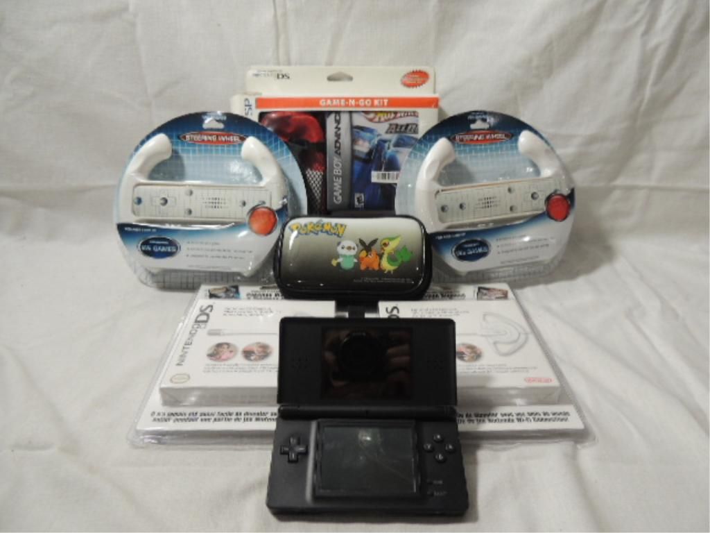 LOT 6 NINTENDO DS ITESM. NINTENDO DS LITE BLUE WITH POKEMON CASE. TWO NEW NINTENDO DS HEADSETS, TWO NEW STEERING WHEEL FOR WII GAMES, NINTENDO DS GAME N GO KIT WITH HOT WHEEL GAME.