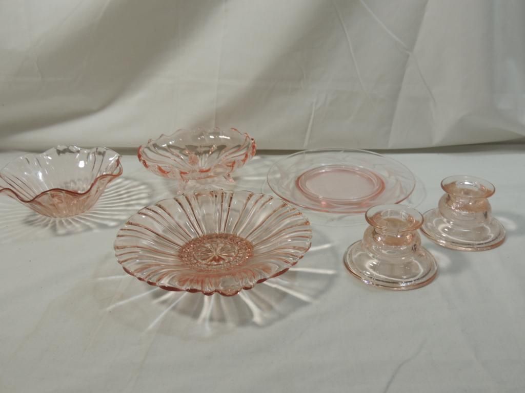ASSORTED PINK DEPRESSION GLASS BOWLS AND CANDLE HOLDERS. AS SHOWN. SEE PHOTO FOR MORE DETAILS.