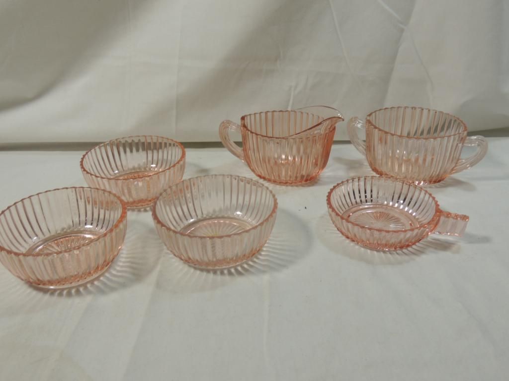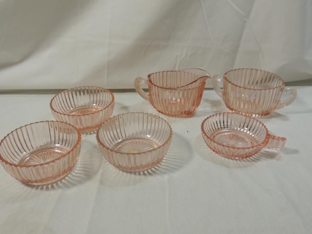 ASSORTED SMALL BOWLS AND MATCHING CREAMER AND SUGAR BOWL AS SHOWN SEE PHOTO FOR MORE DETAILS.