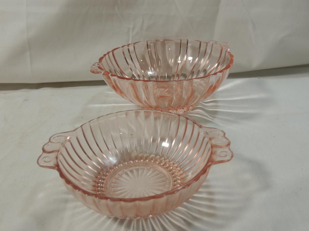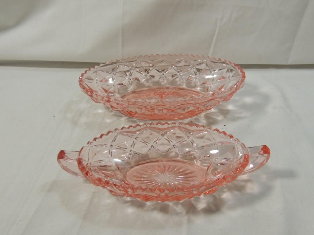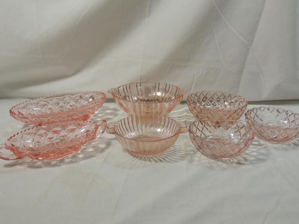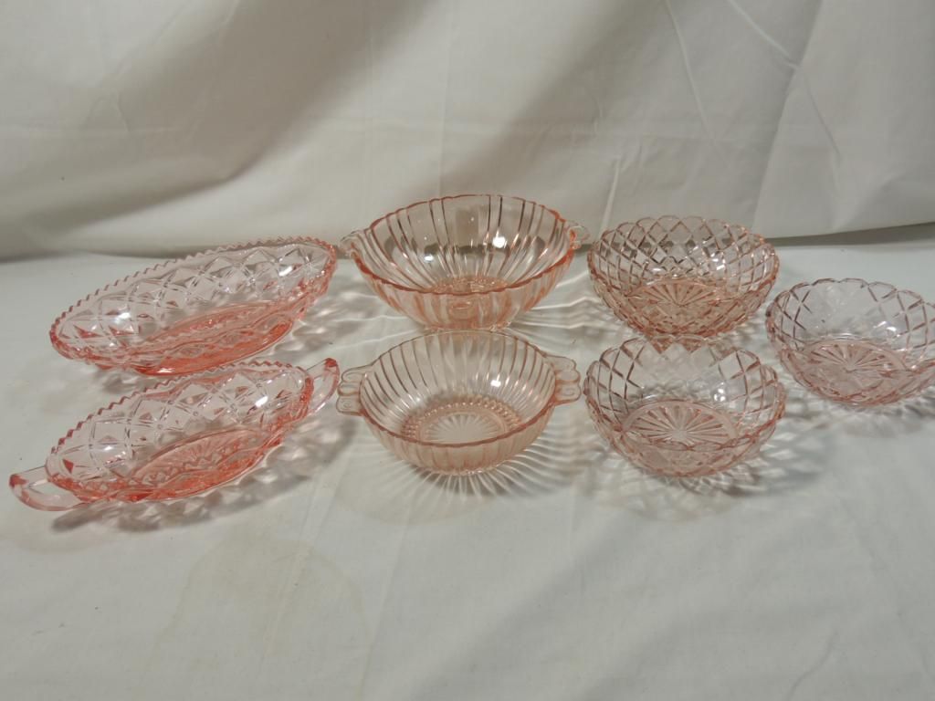 PINK DEPRESSION GLASS BOWLS AND RELISH TRAYS AS SHOWN. SEE PHOTO FOR MORE DETAILS.