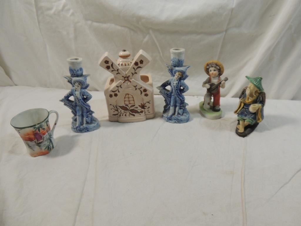 DUTCH WINDMILL PLANTER, FIGURINE CANDLE HOLDER FIGURES, CHINESE, DECORATIVE AS SHOWN SEE PHOTO FOR MORE DETAILS.