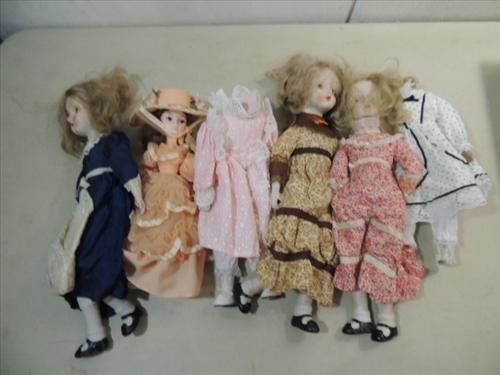 LOT 6 PORCELAIN UNMARKED DOLLS, 2 HAVE HEADS THAT HAVE BROKEN OFF. AS SHOWN. VIEW PICTURE FOR DETAIL.