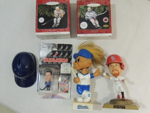 LOT 6 SPORTS COLLECTIBLES: 2 HOCKEY KEEPSAKES, MCGWIRE FIGURINE, BREWERS BOBBLE HEAD, HEADLINER AND MORE. AS SHOWN. VIEW PICTURE FOR DETAIL.