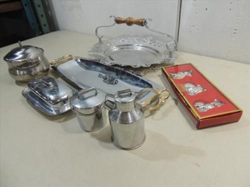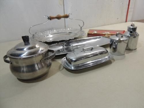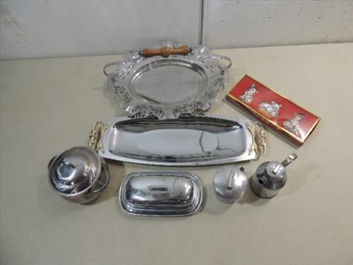 LOT 6 STAINLESS STEEL SERVING PIECES: 2 PLATTERS, BUTTER DISH, POT AND MORE. AS SHOWN. VIEW PICTURE FOR DETAIL.