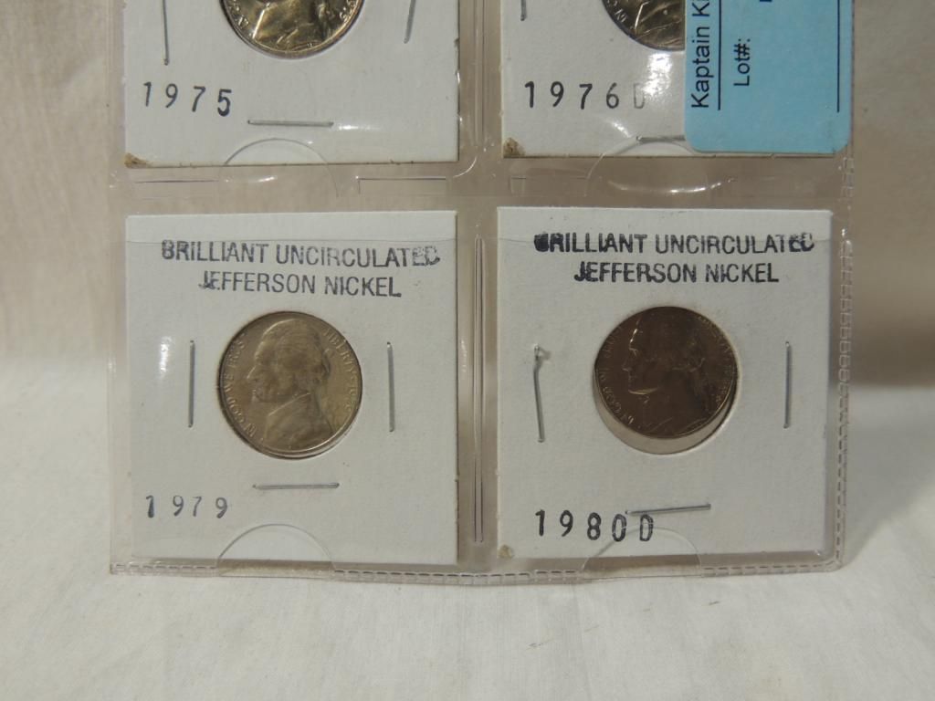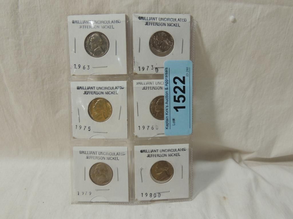 6 BRILLIANT UNCIRCULATED JEFFERSON NICKELS. AS SHOWN. SEE PHOTO FOR MORE DETAILS.