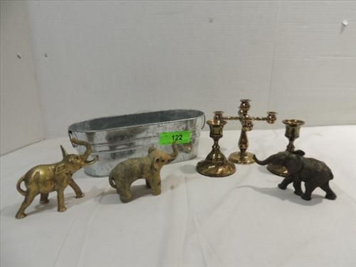 LOT 6 VARIOUS METAL ITEMS: BRASS CANDLE HOLDERS, 3 ELEPHANTS, AND TIN MINI WASH TUB. AS SHOWN. VIEW PICTURE FOR DETAIL.
