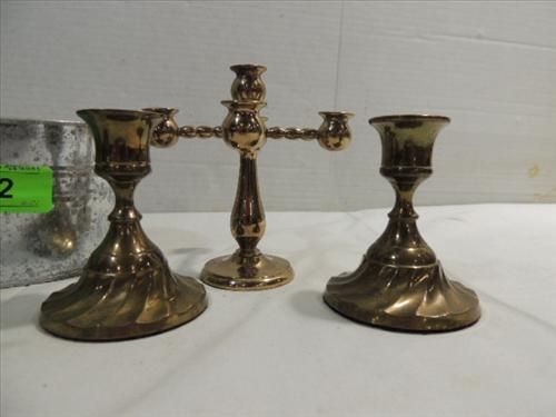 LOT 6 VARIOUS METAL ITEMS: BRASS CANDLE HOLDERS,
