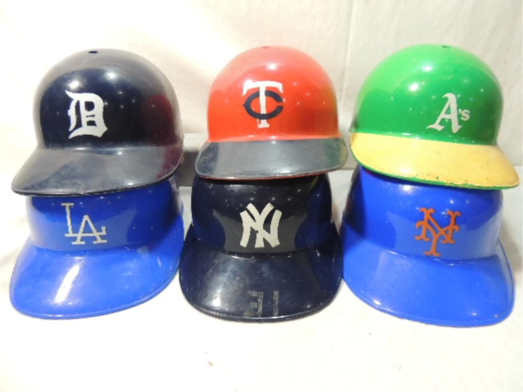 LOT 6 VINTAGE 1969 BASEBALL TEAM HELMETS. AS SHOWN SEE PHOTO FOR MORE DETAILS.