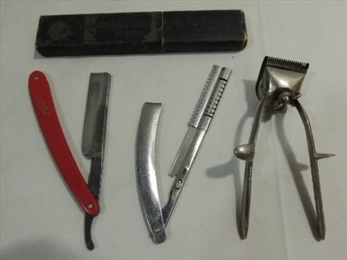 LOT 6 VINTAGE (2) STRAIGHT EDGE RAZORS (RED IMP, MARIANNA) BLADES GOOD, OSTER HAIR TRIMMER, METAL TRAY, NICKEL SILVER CASE AND WINE BOTTLE OPENNER. AS SHOWN. VIEW PICTURE FOR DETAIL.