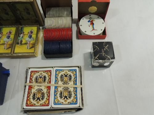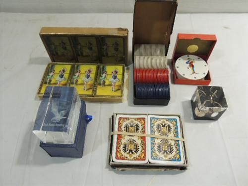 LOT 6 VINTAGE (4) CARD PLAYING DECKS, PENNIES IN PEXIGLASS AND EAGLE LASER IN GLASS GOD BLESS AMERICA. AS SHOWN. VIEW PICTURE FOR DETAIL.