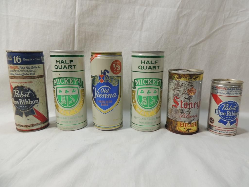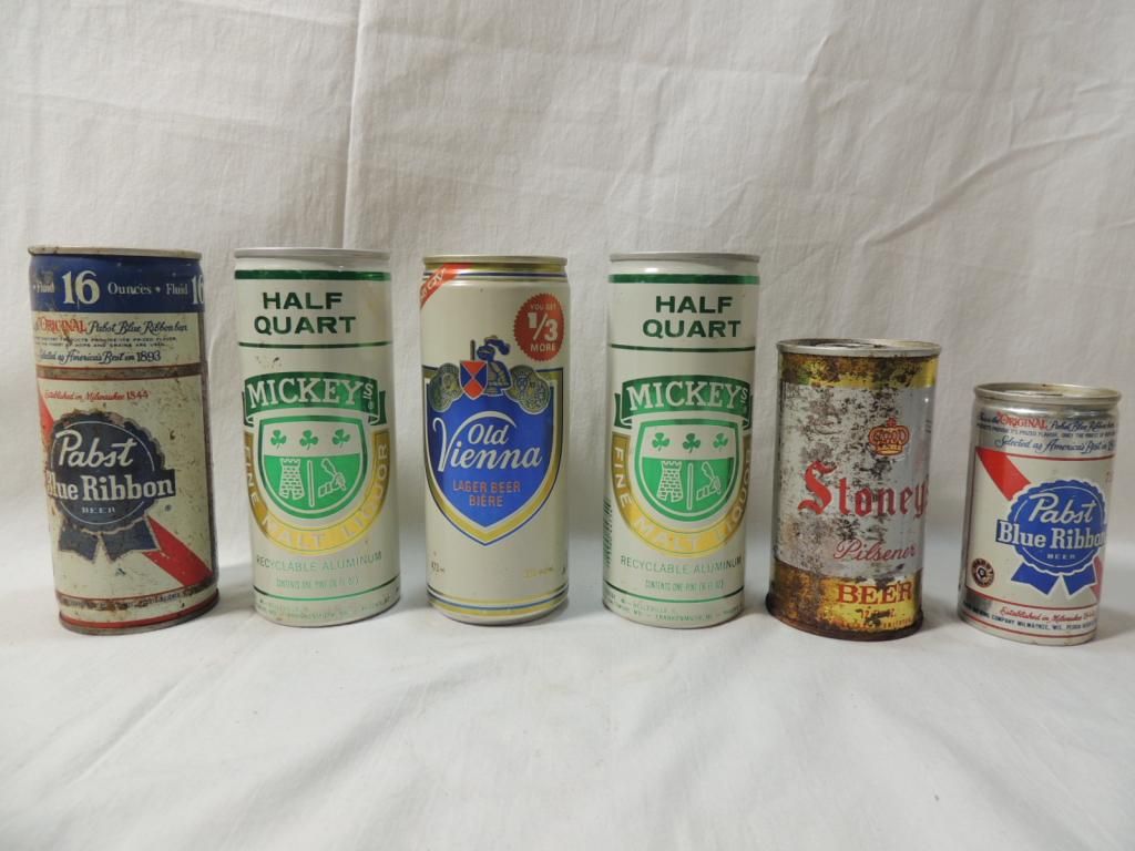 16OZ AND 12 OZ. OLD VIENNA MICKEYS, PABST BLUE RIBBON, VINTAGE BEER CANS. MEMORABILIA. BEER COLLECTIBLE. BREWARANA. MALT LIQUOR. RARE CANS. SOME FULL SOME EMPTY. ASSORTED. AS SHOWN. SEE PHOTO FOR MORE DETAILS.