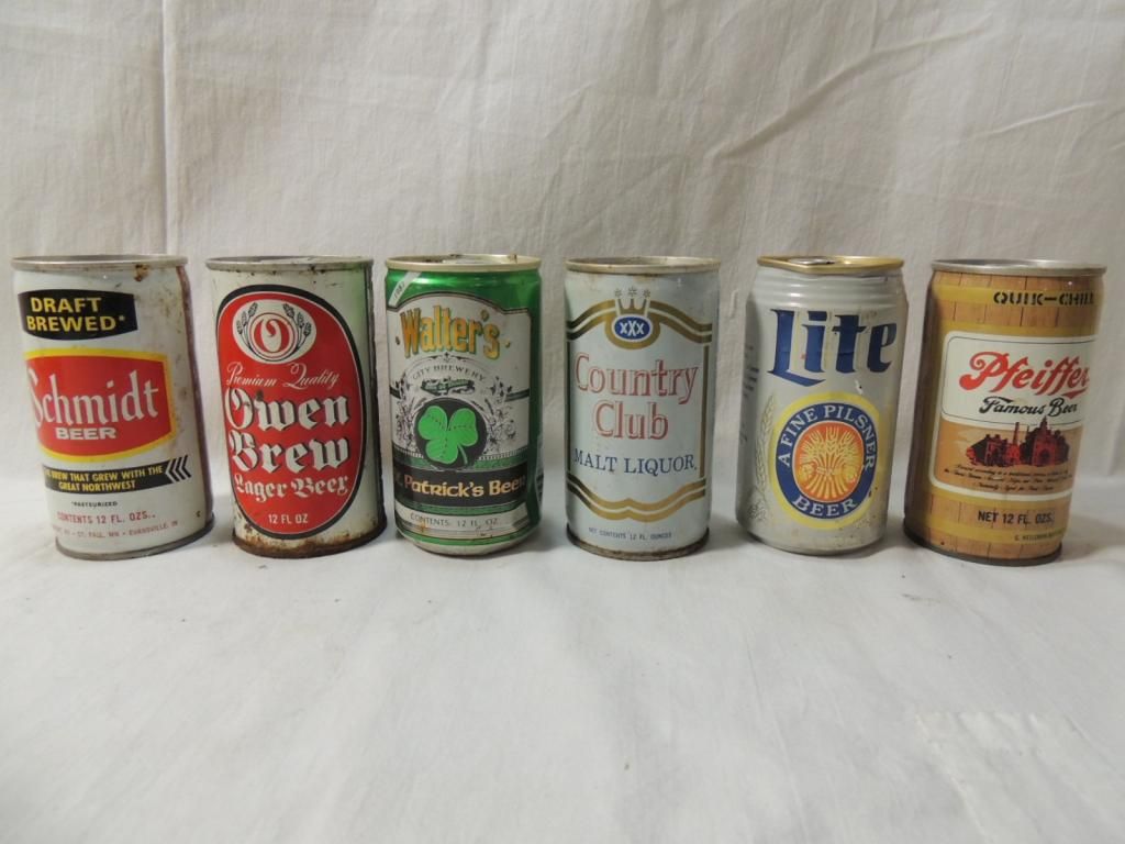 SOME FULL SOME EMPTY 12 OZ CANS. COUNTRY CLUB, WALTERS, OWEN BREW, LITE, SCHMIDT, PFEIFFER. VINTAGE BEER CANS. MEMORABILIA. BEER COLLECTIBLE. BREWARANA. MALT LIQUOR. RARE CANS. AS SHOWN. SEE PHOTO FOR MORE DETAILS.