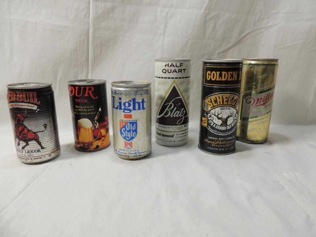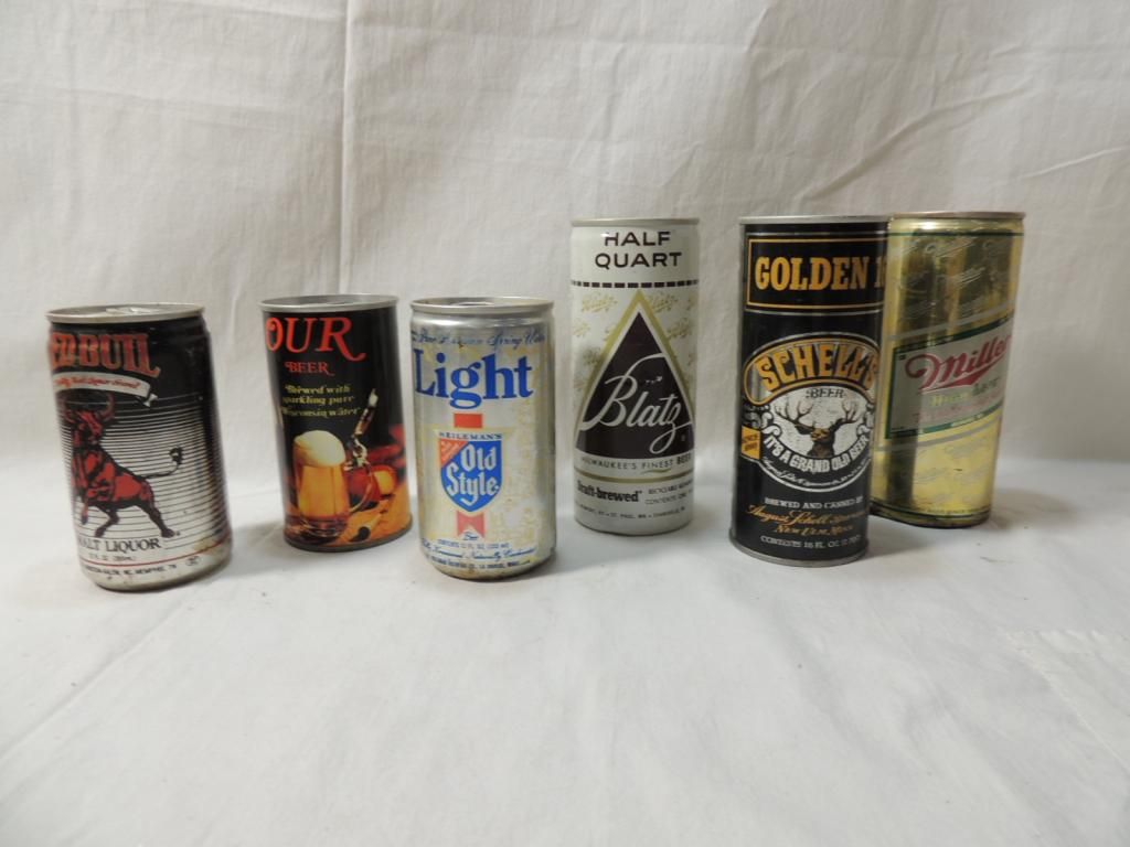 VARIOUS SIZES. 12OZ, 16OZ, RED BULL, SCHELLS BLATZ, OLD STYLE, OUR BEER. VINTAGE BEER CANS. MEMORABILIA. BEER COLLECTIBLE. BREWARANA. MALT LIQUOR. RARE CANS. AS SHOWN. SEE PHOTO FOR MORE DETAILS.