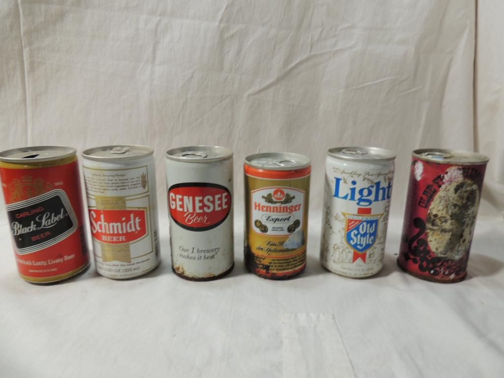 SCHMIDT, GENESEE, LIGHT OLD STYLE, OLDE FROTHLIVGSLOSH, HENNINGER, CARLING BLACK LABEL. 12 OZ CANS. SOME FULL SOME EMPTY. VINTAGE BEER CANS. MEMORABILIA. BEER COLLECTIBLE. BREWARANA. MALT LIQUOR. RARE CANS. AS SHOWN. SEE PHOTO FOR MORE DETAILS.