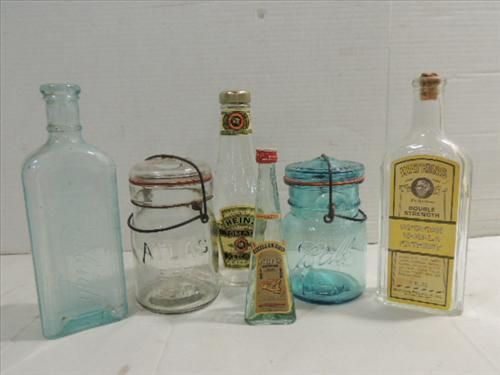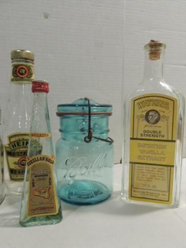 LOT 6 VINTAGE BOTTLES: ATLAS E-Z SEAL, BALL #5, WATKINS VANILLA EXTRACT, RAWLIGHS. AS SHOWN. VIEW PICTURE FOR DETAIL.