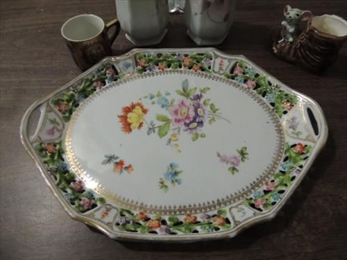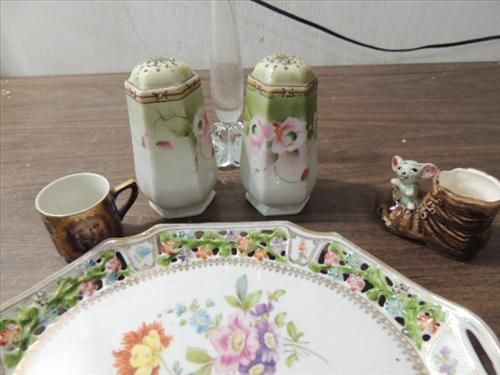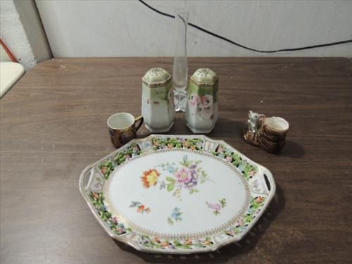 LOT 6 VINTAGE CERAMIC COLLECTIBLES: PRUSSIAN SALT & PEPPER SHAKERS, BAVARIAN TRAY, AND MORE. AS SHOWN. VIEW PICTURE FOR DETAIL.