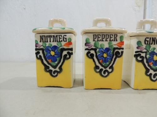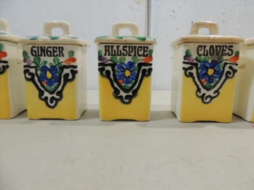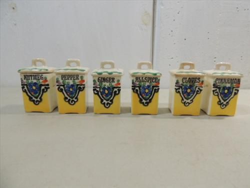 LOT 6 VINTAGE CERAMIC SPICE HOLDERS MADE IN CZECHOSLOVAKIA. PEPPER, NUTMEG, ALLSPICE, GINGER, CINNAMON, GLOVES. AS SHOWN. VIEW PICTURE FOR DETAIL.