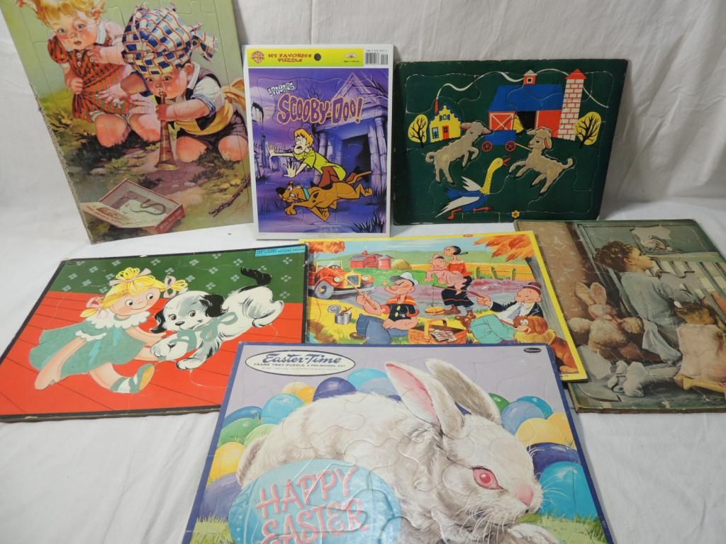 VINTAGE CHILDRENS PUZZLES POPEYE, EASTER, LITTLE GIRL WITH PUPPY, SCOOBY DOO, FARM. CARDBOARD BOARD PUZZLE. AS SHOWN. SEE PHOTO FOR MORE DETAILS.