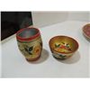 LOT 6 VINTAGE COLLECTIBLE: PLASTER CAST KENNEDY MEDALLION, RUSSIAN WOOD CUP & BOWL, LOT 2 BAYREUTH CHINA PLATES AND 1 OLD ENGLISH TIN WITH LID. AS SHOWN. VIEW PICTURE FOR DETAIL.