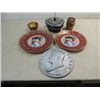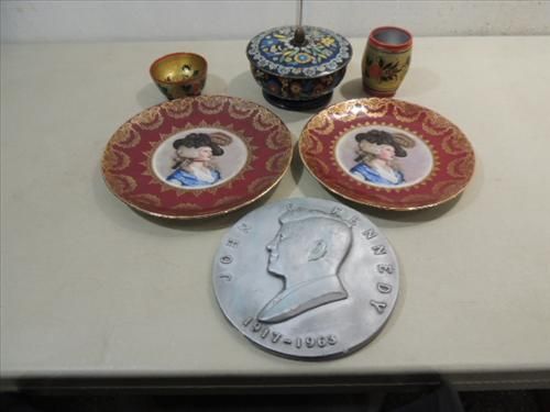 LOT 6 VINTAGE COLLECTIBLE: PLASTER CAST KENNEDY MEDALLION, RUSSIAN WOOD CUP & BOWL, LOT 2 BAYREUTH CHINA PLATES AND 1 OLD ENGLISH TIN WITH LID. AS SHOWN. VIEW PICTURE FOR DETAIL.