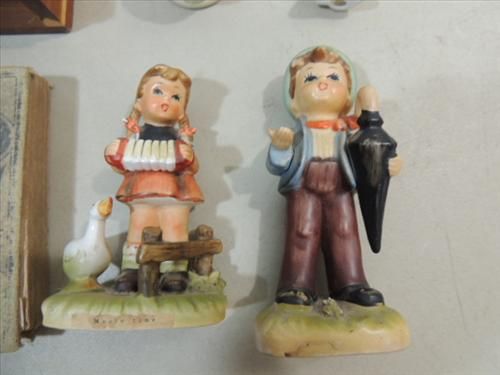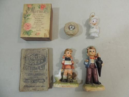 LOT 6 VINTAGE COLLECTIBLES: 2 ERIC STAUFFER HUMMEL LIKE FIGURINES, PRECIOUS MOMENT FIGURINE, 1911 DICTIONARY, AND A JEWELRY BOX. AS SHOWN. VIEW PICTURE FOR DETAIL.