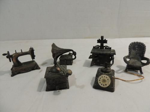 LOT 6 VINTAGE DIE CAST METAL PENCIL SHARPENERS: PHONOGRAPH, WICKKER CHAIR, COFFEE GRINDER, SEWING MACHINE & STOVE. AS SHOWN. VIEW PICTURE FOR DETAIL.