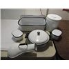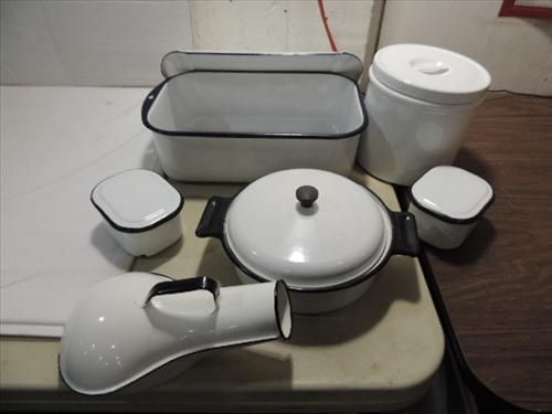 LOT 6 VINTAGE ENAMALWARE: 3 LIDDED SPECIMEN TRAYS, CANNISTER, LIDDED COOK PAN. AS SHOWN. VIEW PICTURE FOR DETAIL.