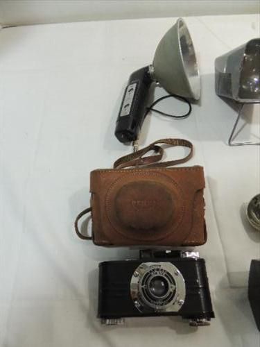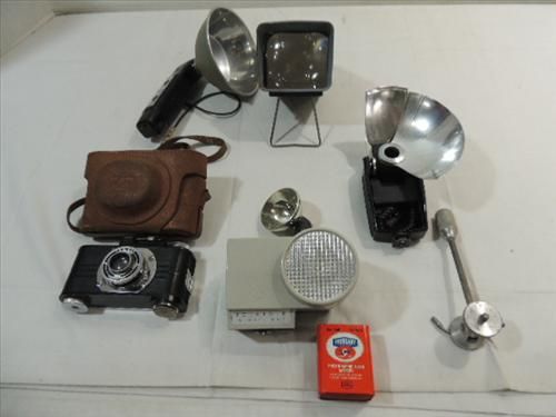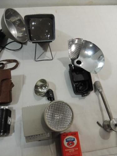 LOT 6 VINTAGE PHOTOGRAPHY EQUIPMENT: ARGUS 35MM CAMERA, 2 FLASH UNITS, 2 35MM SINGLE SLIDE VIEWER. AS SHOWN. VIEW PICTURE FOR DETAIL.