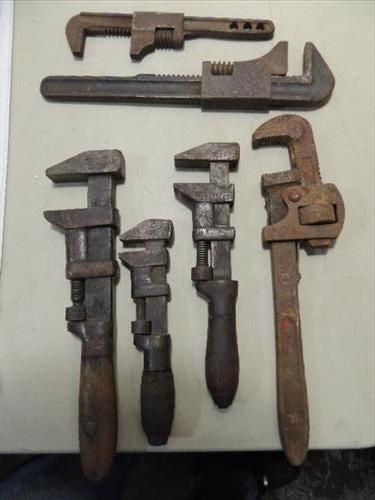 LOT 6 VINTAGE PIPE OR MONKEY WRENCHES (3) OLDER STYLE SCREW THREAD & WOOD HANDLE. AS SHOWN. VIEW PICTURE FOR DETAIL.