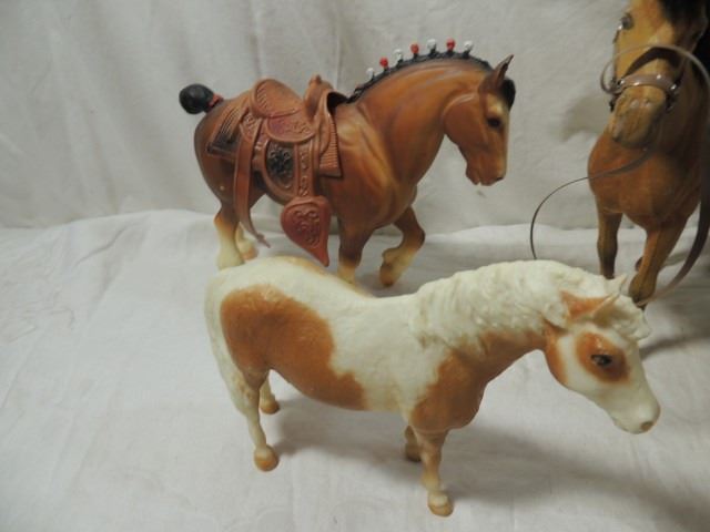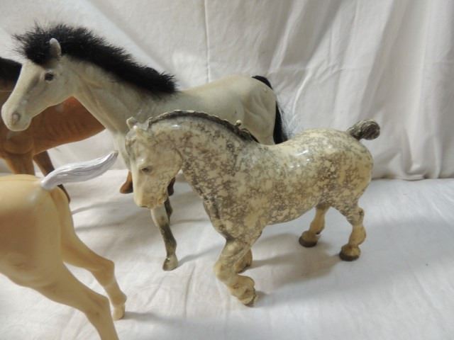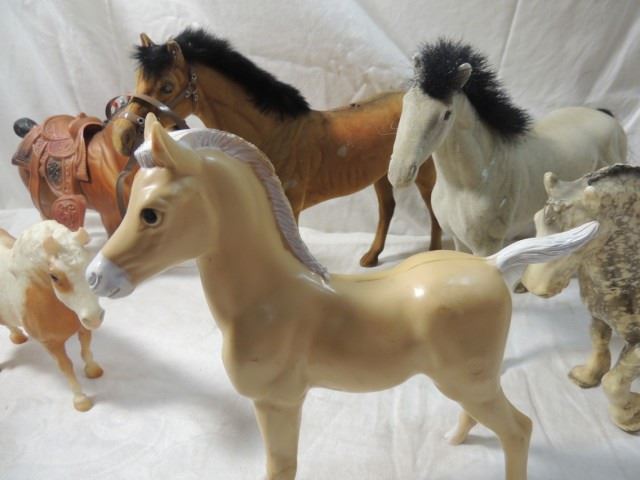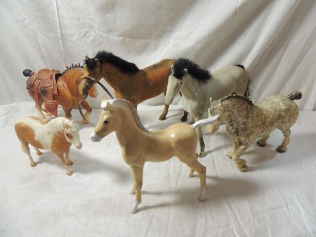LOT 6 VINTAGE PLASTIC HORSE FIGURES AS SHOWN.