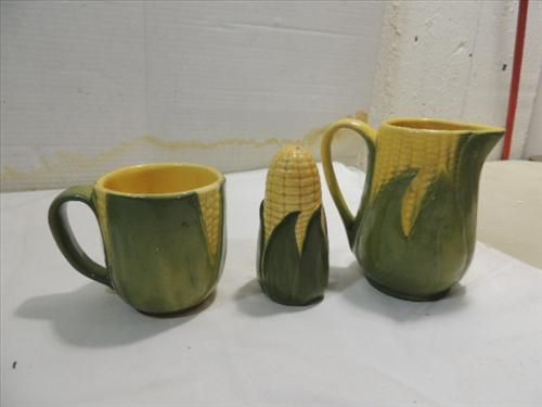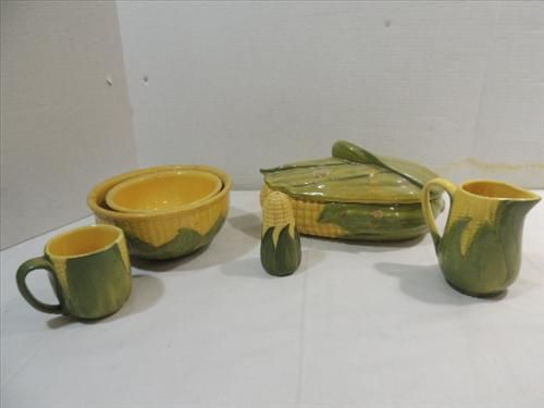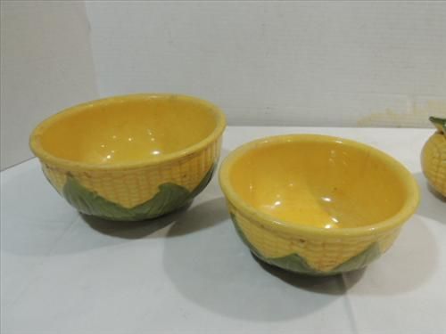 LOT 6 VINTAGE SHAWNEE CORN KING DINNERWARE: #6 & 8 NESTED BOWLS, #70 CREAMER, PEPPER SHAKER, COFFEE CUP, #74 CASSAROLE. AS SHOWN. VIEW PICTURE FOR DETAIL.