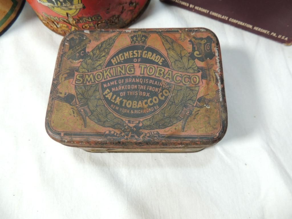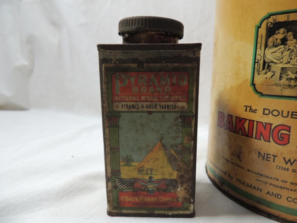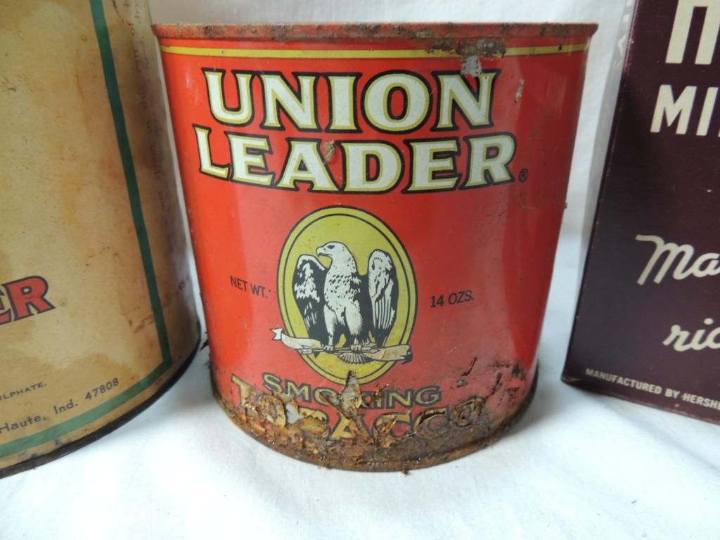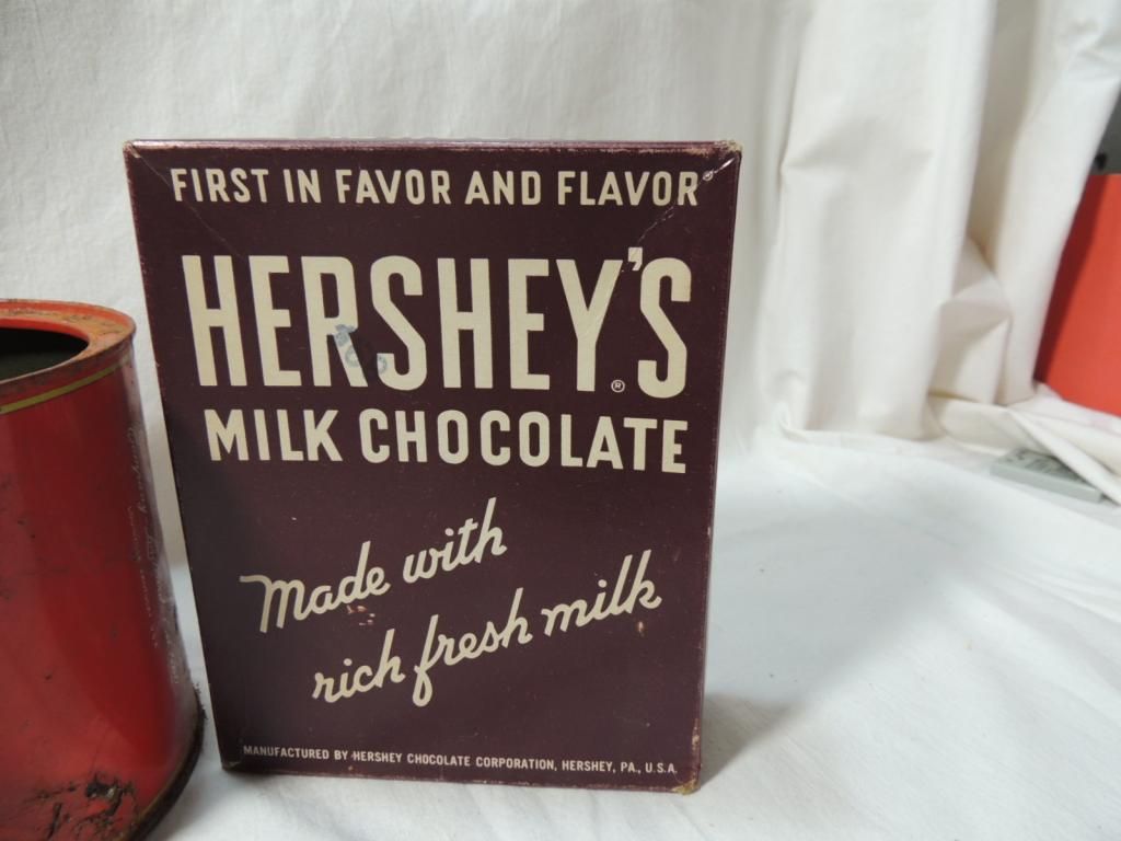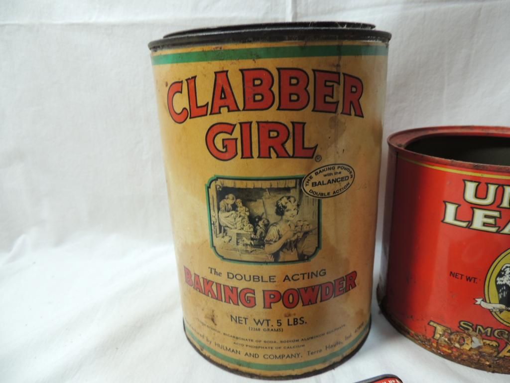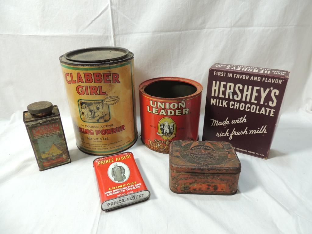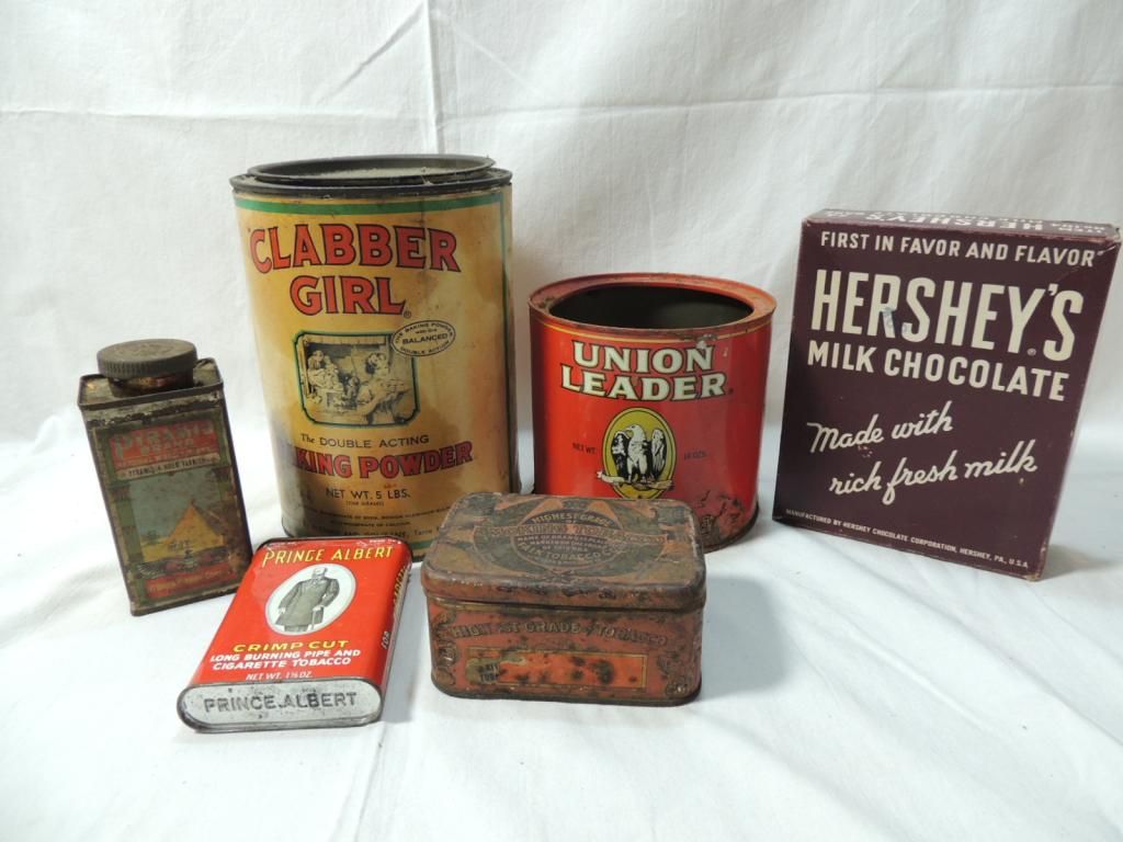 CLABBER GIRL BAKING POWDER, UNION LEADER SMOKING TOBACCO, HIGHEST GRADE FLAK TOBACCO SMOKING TOBACCO. PRINCE ALBERT CRIMP CUT LONG BURNING TOBACCO, PYRAMID BRAND WOOD VARNISH. HERSEYS MILK CHOCOLATE BOX. COLLECTIBLES. VINTAGE KITCHENAILA. MEMORIBLILA. AS
