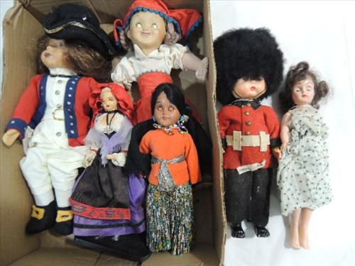 LOT 6 VINTAGE VARIOUS STYLE CULTURAL DOLLS: BRITISH, INDIAN, DUTCH AND MORE. AS SHOWN. VIEW PICTURE FOR DETAIL.