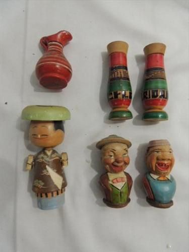 LOT 6 VINTAGE WOOD COLLECTIBLES: 1 ORIENTAL BOBBLE HEAD FIGURINE, 2 HAND CARVED OLD MEN BOTTLE STOPPERS, AND MORE. AS SHOWN. VIEW PICTURE FOR DETAIL.