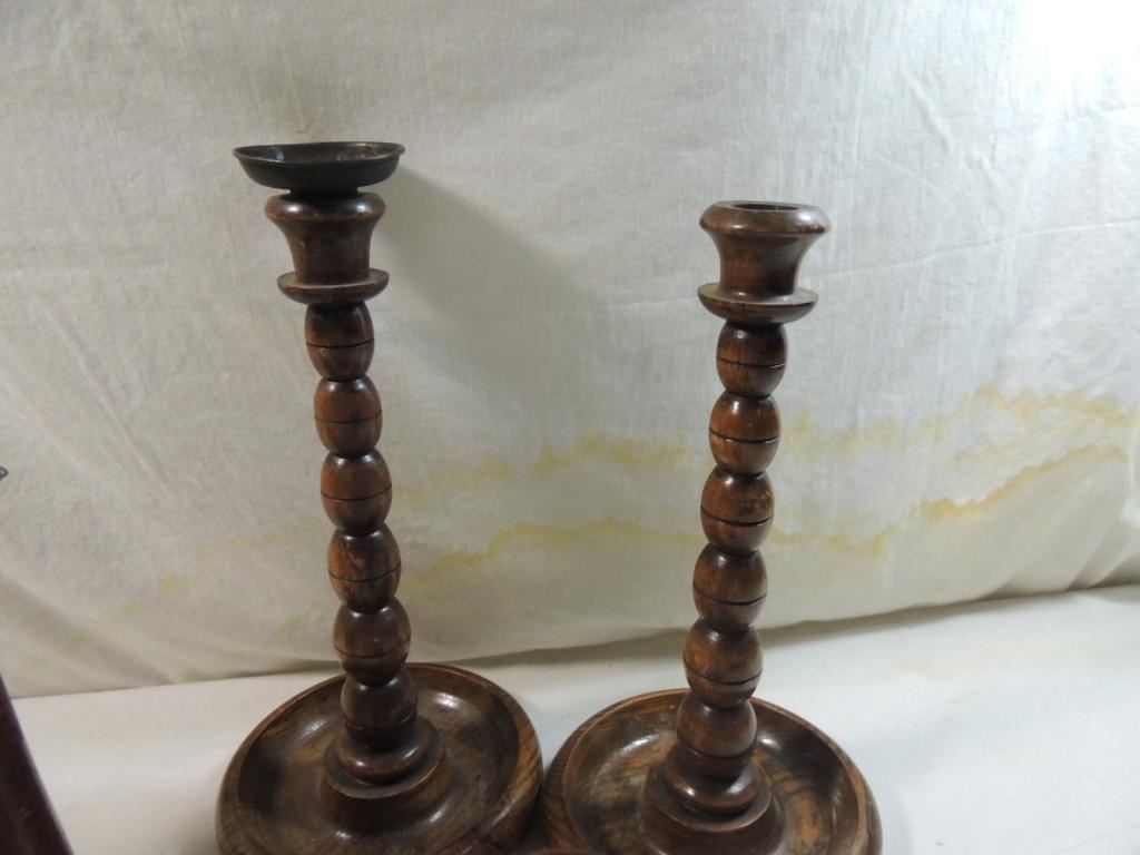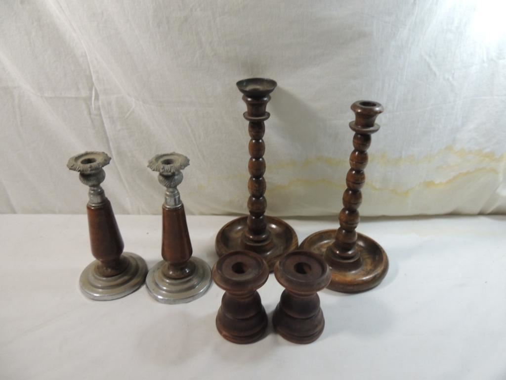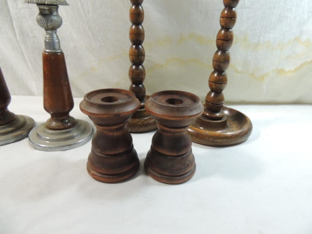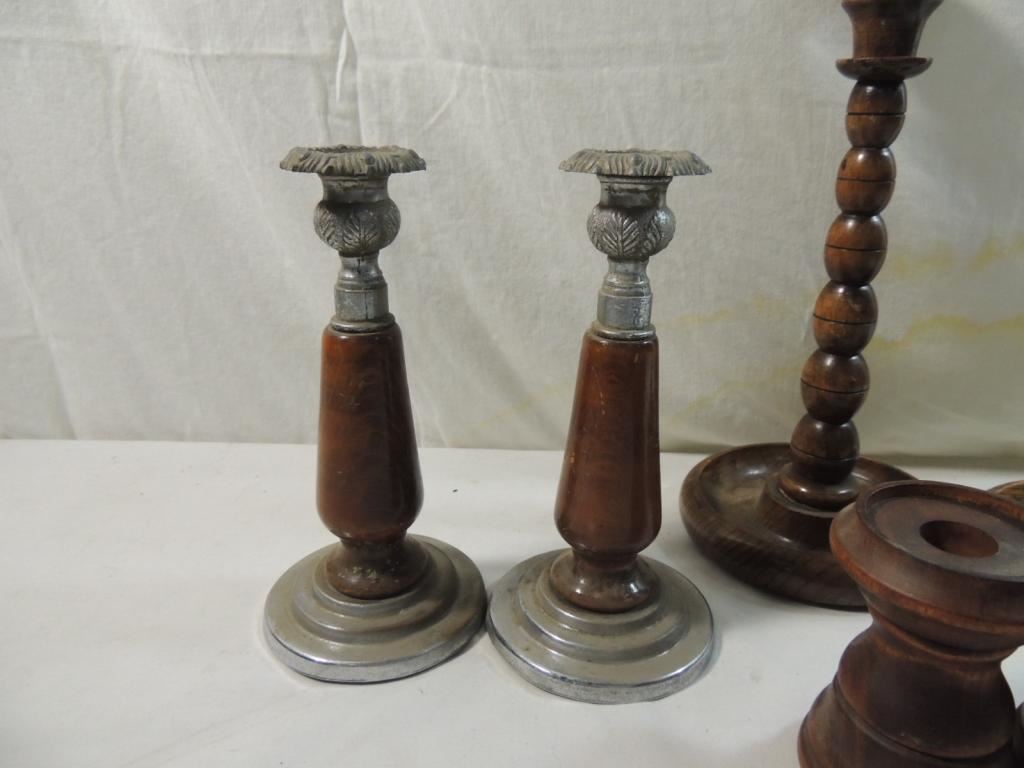 WOODEN DECORATIVE CANDLE STICK HOLDERS. VINTAGE CANDLE HOLDERS AS SHOWN SEE PHOTO FOR MORE DETAILS.