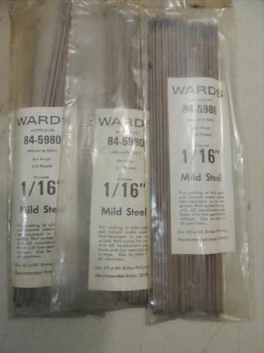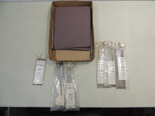 LOT 7 (6) PACKS WELDING RODS (MILD STEEL, IRON POWDER, COPPER COATED) & STACK OF CROCUS CLOTH. AS SHOWN. VIE WPICTURE FOR DETAIL.