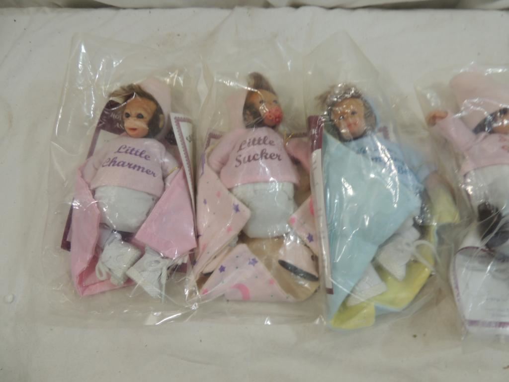 COLLECTIBLE DOLLS, BARREL OF CHIMPS COLLECTION AS SHOWN SEE PHOTO FOR MORE DETAILS.