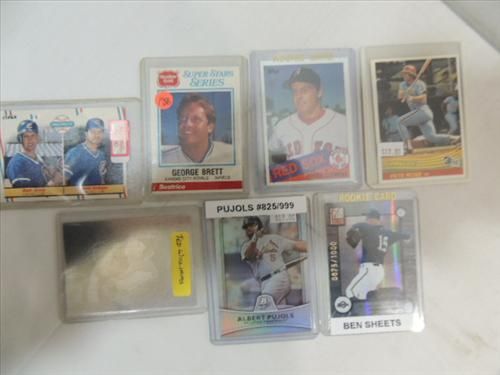 LOT 7 ASSORTED BASEBALL PLAYER CARDS: CLEMENS ROOKIE CARD, GEORGE BRETT, PETE ROSE,TED WILLIAMS HOLO CARD AND MORE. AS SHOWN. VIEW PICTURE FOR DETAIL.