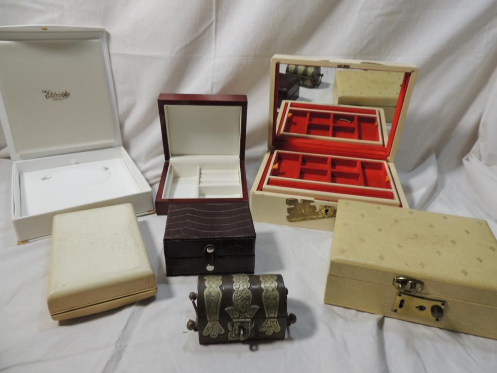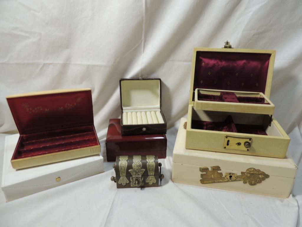 ASSORTED JEWELRY BOXES. METAL DECORATIVE, RING, NECKLACE. AS SHOWN. SEE PHOTO FOR MORE DETAILS.