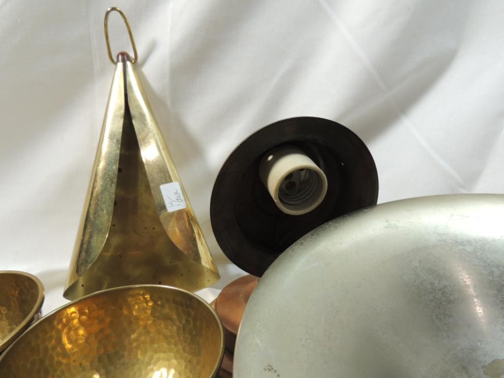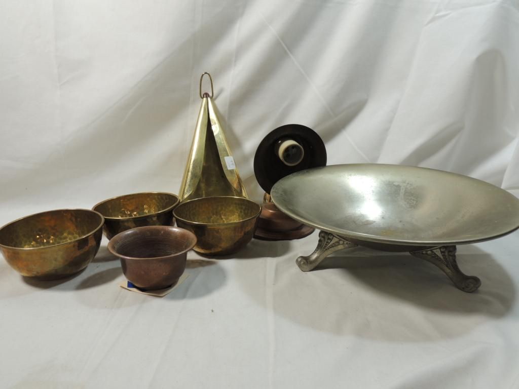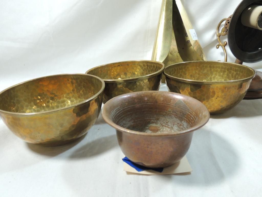 COPPER WALL SCONCE, THREE MATCHING BRASS BOWLS PLANTERS, CRUMB CATCHERS. AS SHOWN. SEE PHOTO FOR MORE DETAILS.