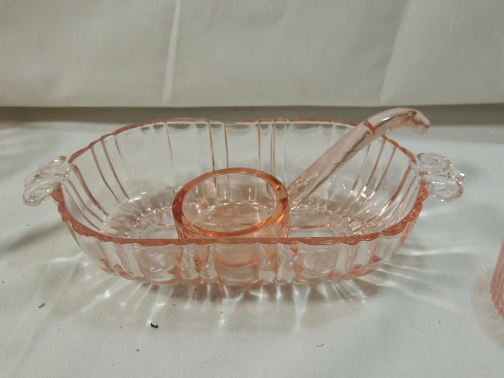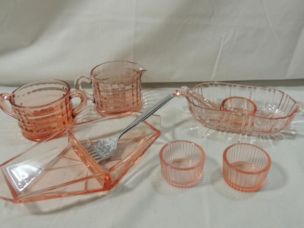 DIVIDED RELISH TRAY, SMALL CUPS, CREAMER AND SUGAR CUP, RELISH TRAY, AS SHOWN. SEE PHOTO FOR MORE DETAILS.