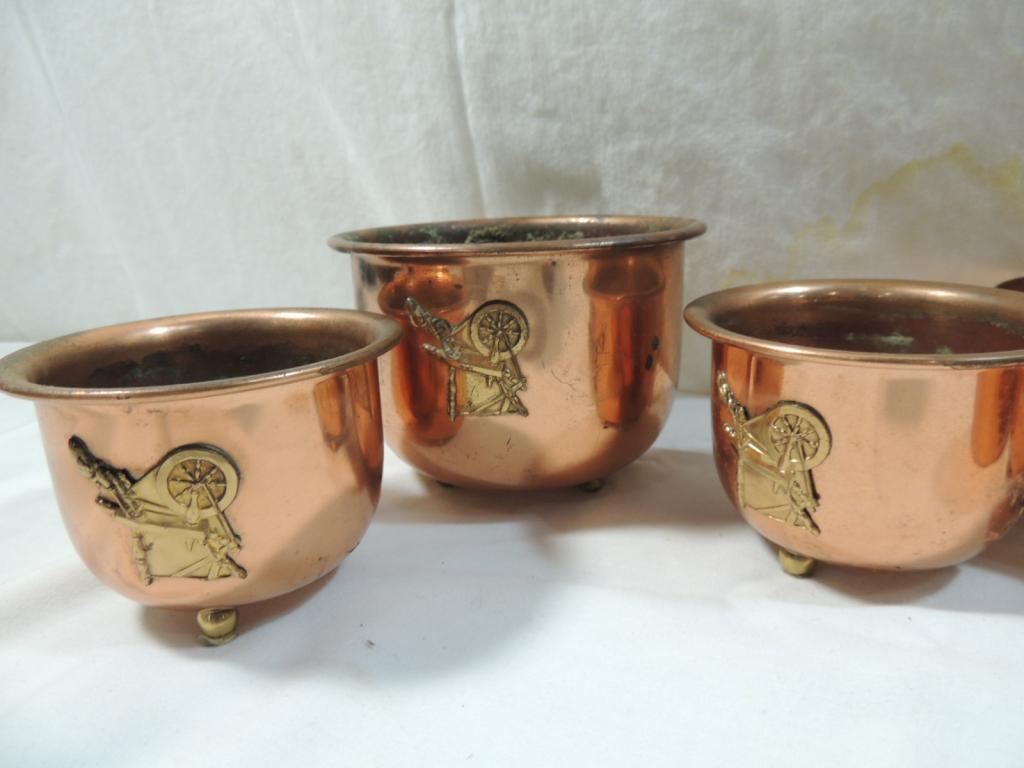 ASSORTED VINTAGE COPPER POTS, PLANTERS, BOWL, MANY USES, COLLECTIBLE, DECORATIVE AS SHOWN SEE PHOTO FOR MORE DETAILS.