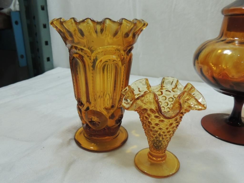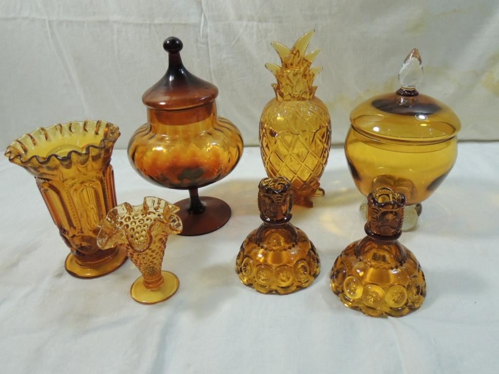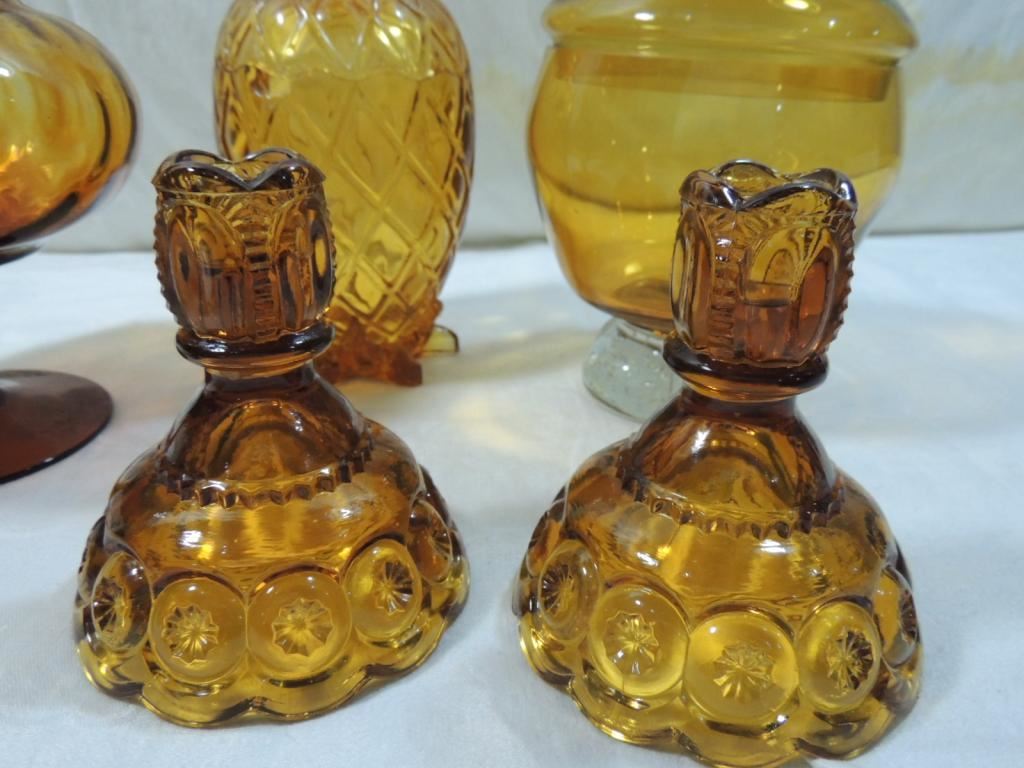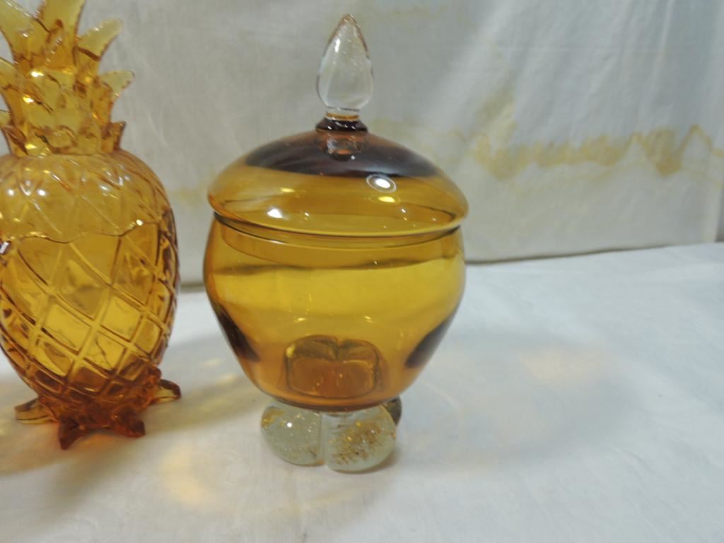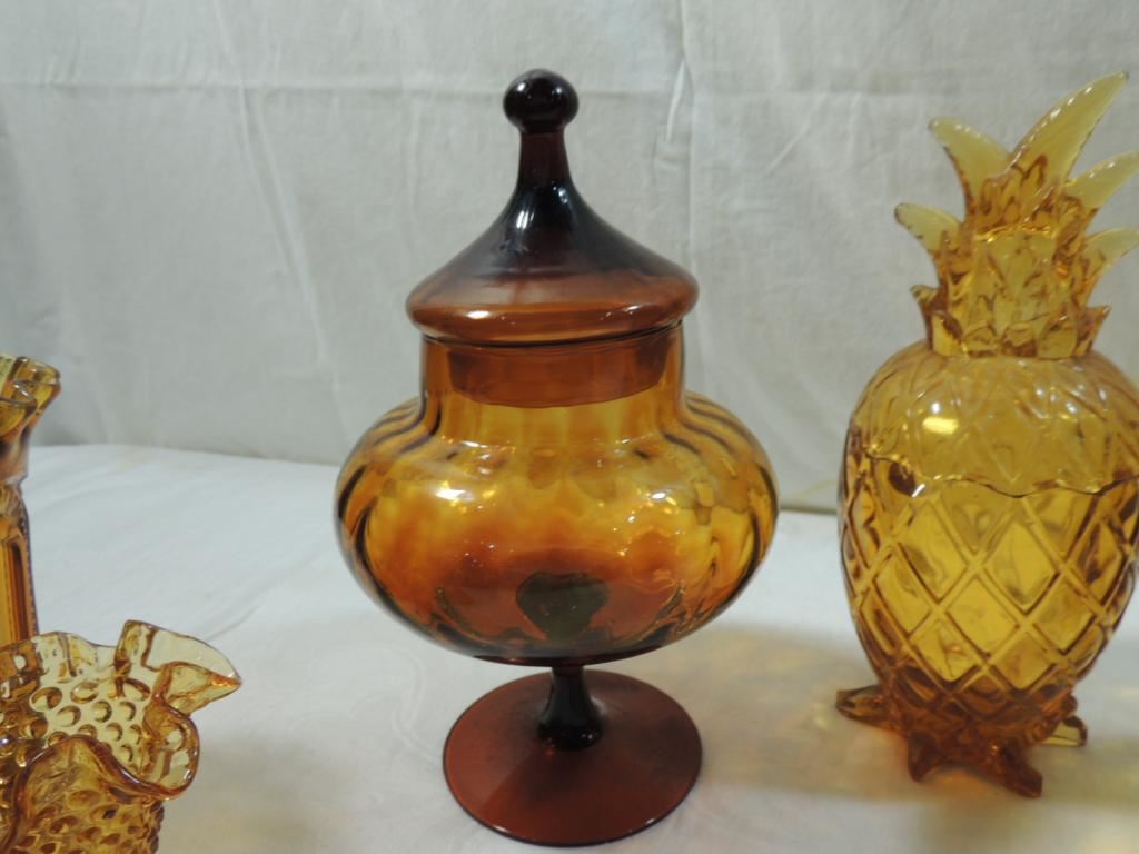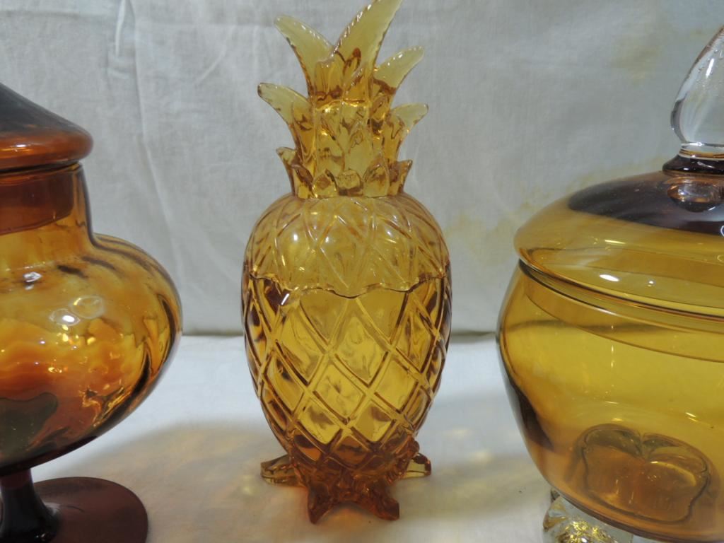 COVERED JARS, CANDY DISHES, VASES, CANDLESTICK HOLDERS, PINEAPPLE, FOOTED DECORATIVE VINTAGE COLLECTIBLE AS SHOWN SEE PHOTO FOR MORE DETAILS