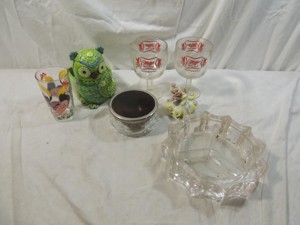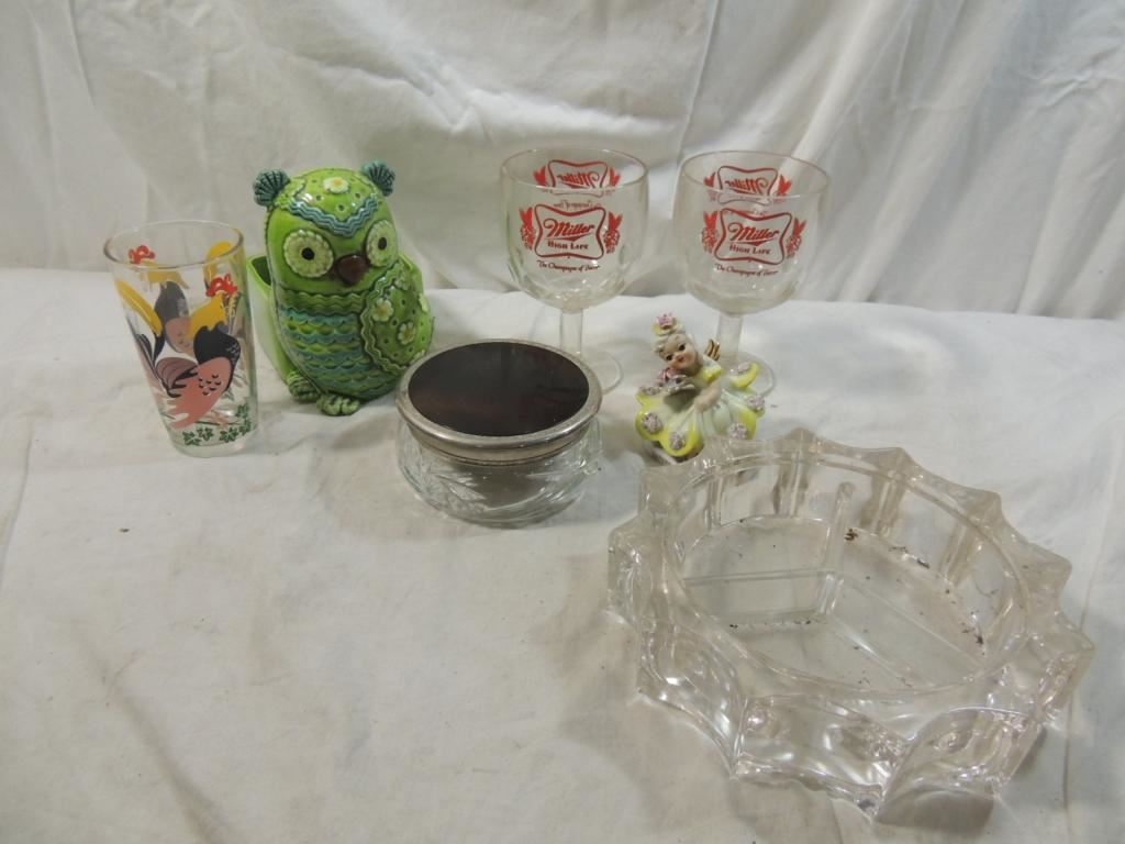 VINTAGE DECORATIVE OWL PLANTER, GLASSES, FIGURINES, LARGE HEAVY GLASS ASHTRAY, DECORATIVE BOX AS SHOWN SEE PHOTO FOR MORE DETAILS.