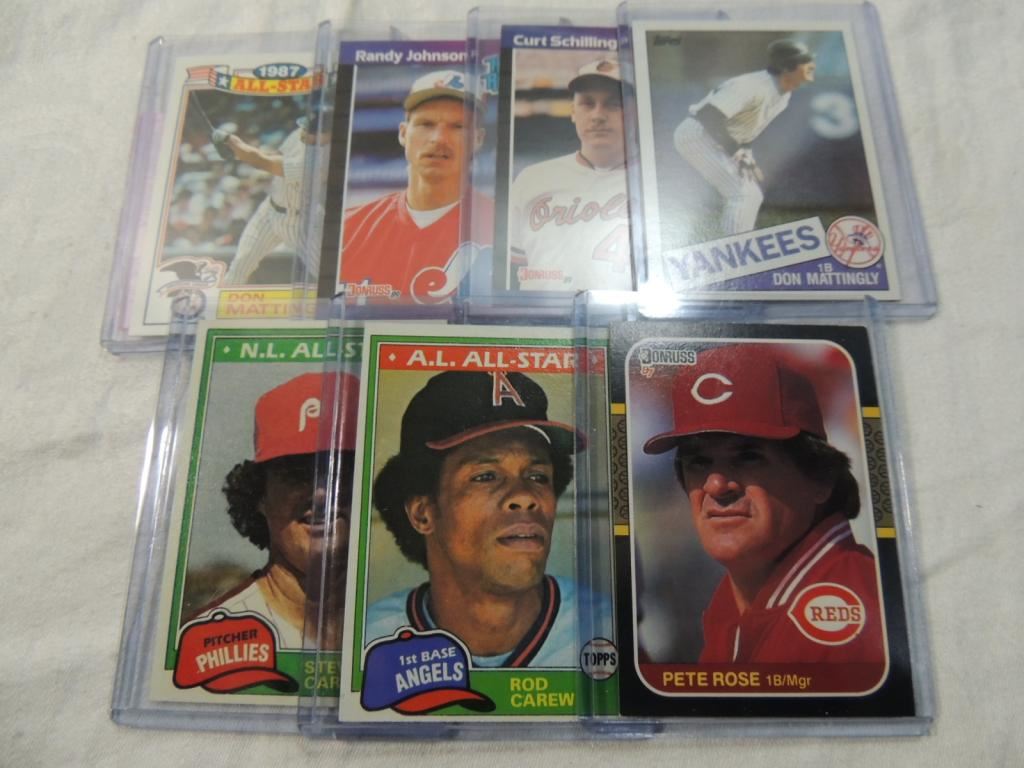 CURT SCHILLING, RANDY JOHNSON, DON MATTINGLY, STEVE CARLTON, ROD CAREW, PETE ROSE, DON MATTINGLY, BASEBALL PLAYER CARDS. TRADING CARDS. COLLECTIBLE. BASEBALL MEMORABILIA. GOOD CONDITION AS SHOWN. SEE PHOTO FOR MORE DETAILS.