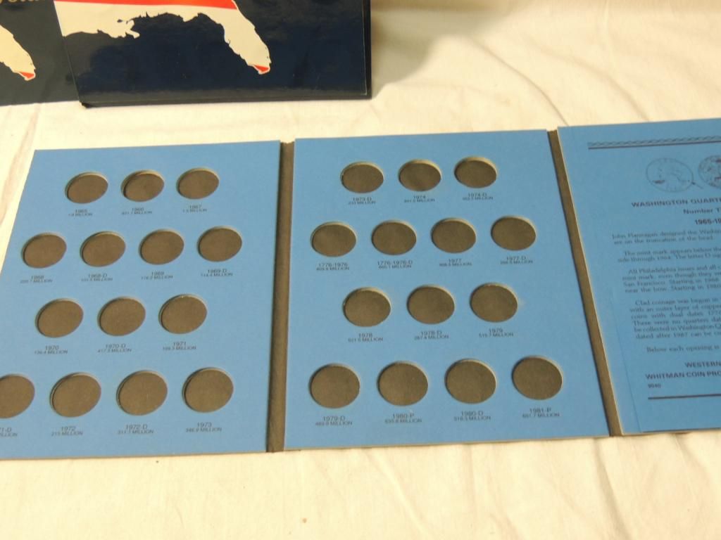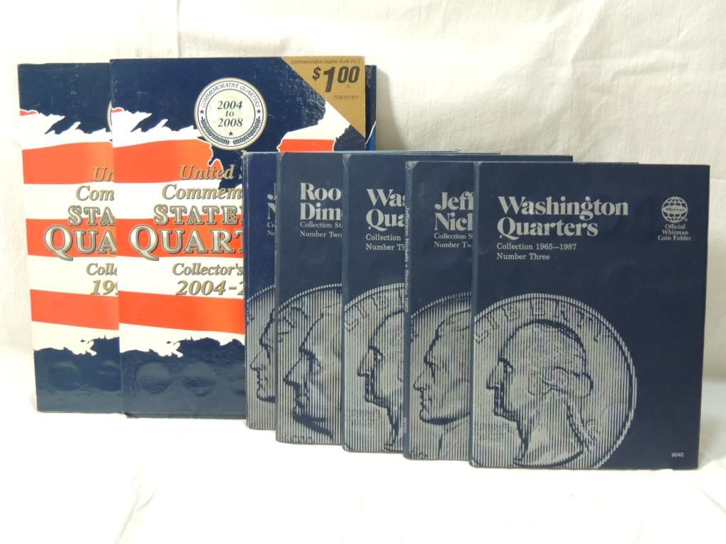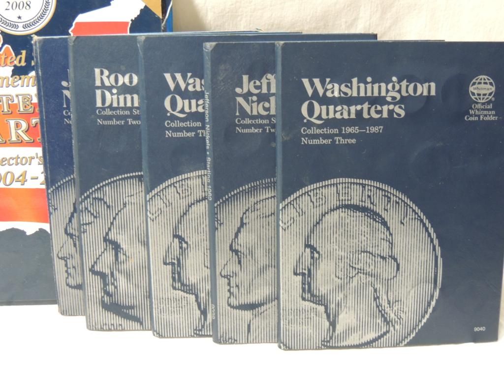 WASHINGTON QUATERS 1965-1987, WASHINGTON QUATERS 1965-1987, ROOSEVELT DIMES STARTING 1965, JEFFERSON NICKELS 1938-1961 JEFFERSON NICKELS STARTING 1962. UNITED STATES STATEHOOD QUATERS 1999- 2003 & 2004-2008 NO COINS INCLUDED. AS SHOWN. SEE PHOTO FOR MORE