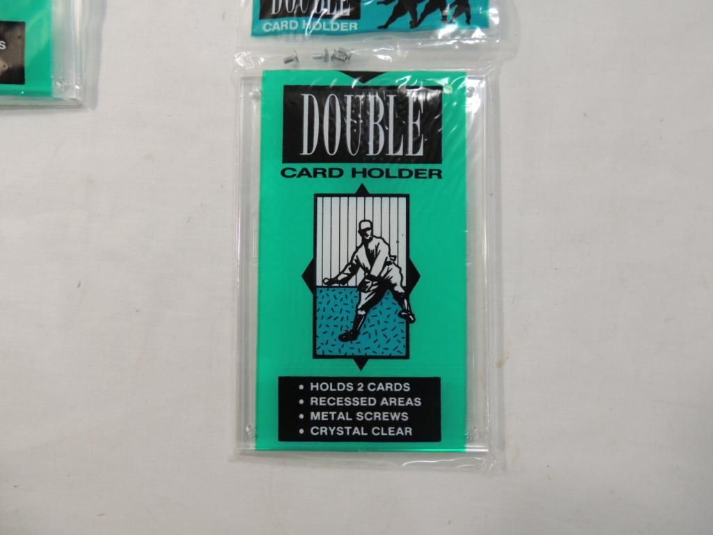 NEW NEVER OPENED DOUBLE CARD HOLDER. HOLDS 2 CARDS. RECESSED AREAS, METAL SCREWS CRYSTAL CLEAR. PROTECTIVE TRADING CARD ACCESSORIES. AS SHOWN SEE PHOTO FOR MORE DETAILS.