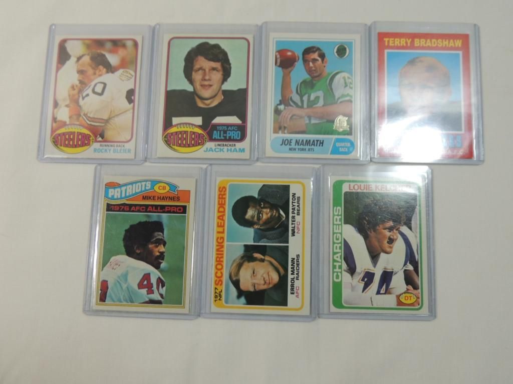 LOT 7 FOOTBALL CARDS. PATRIOTS MIKE HAYNES, 1977 NFL SCORING LEADERS MANN AND PAYTON, CHARGERS LOUIE KELCHER, STEELERS ROCKY BLEIER, STEELERS JACK HAM, JETS JOE NAMATH, STEELERS TERRY BRADSHAW. SEE PICTURE FOR DETAILS. AS SHOWN.