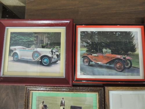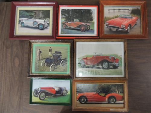 LOT 7 FRAMED PRINTS OF VINTAGE CARS: BUICK, CORVETTE, AND MORE. AS SHOWN. VIEW PICTURE FOR DETAIL.