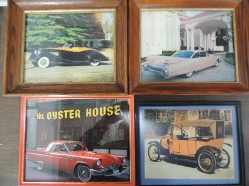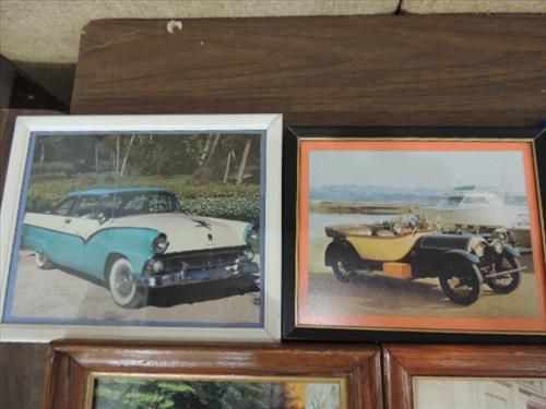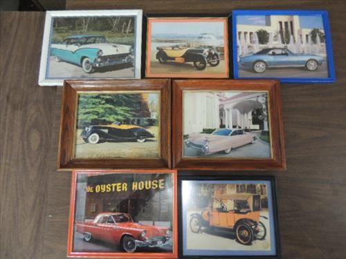 LOT 7 FRAMED PRINTS OF VINTAGE CARS: CADILLAC, THUNDERBIRD, 1914 WOODS, SIMPLEX AND MORE. AS SHOWN. VIEW PICTURE FOR DETAIL.